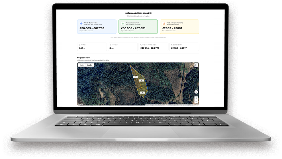 Aizpildi formu un saņem meža īpašuma vērtības scenārijus, nogabalu pārskatu, izstrādes un kopšanas potenciālu, inventarizācijas statusu un interaktīvu karti ar detalizāciju pa nogabaliem.